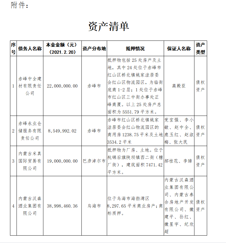一、拟处置惩罚债权情形:均为我公司受让的银行不良债权资产。阻止2021年12月8日,各债务企业尚欠我公司债权本金金额见附表。资产漫衍于内蒙古自治区赤峰市、巴彦淖尔市、乌海市等地。(注:阻止生意日的利息一并处置惩罚,典质担保情形可能保存瑕疵,须竞买者自行视察判断)。